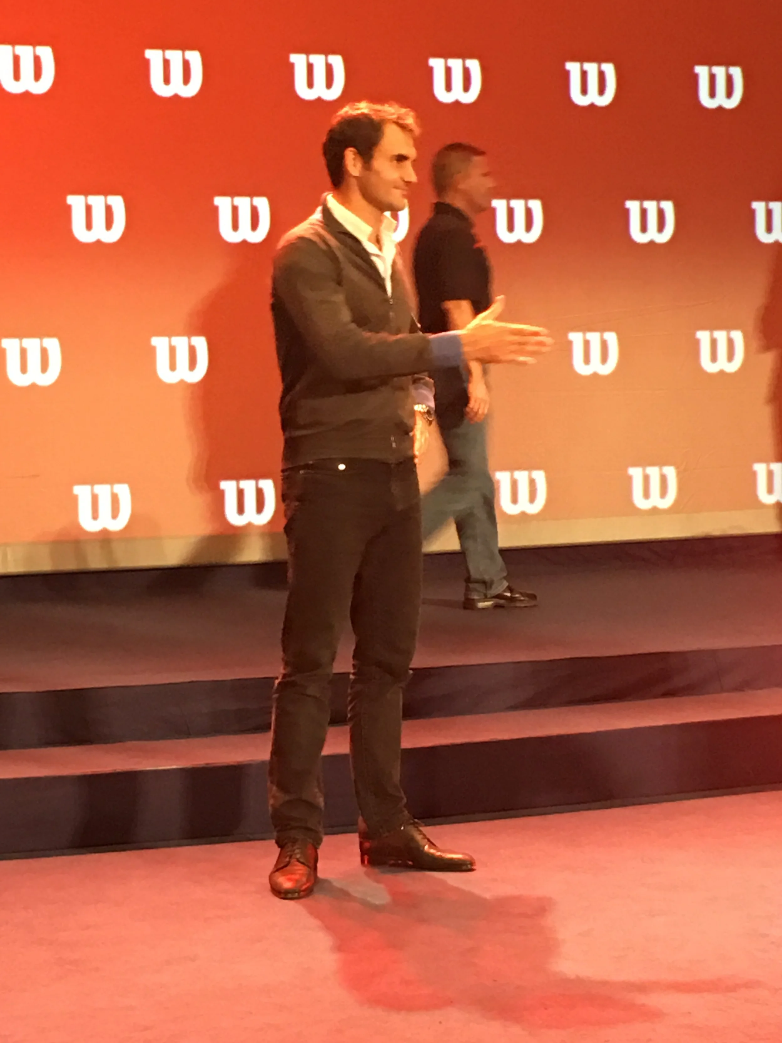 One of the highlights of work was the annual Global Sales Launch held every year in Europe. The idea was to bring together in one place all of the marketing/sales teams from each market and from each brand. I was not invited to every one but did manage to be invited to one in Athens and a few in Spain. (Barcelona/Sitges). We would have breakouts by brand/sport and learn about all of the new products coming and usually in the middle of the week the sales team would join for a “Grand Session.” Each brand leader would stand up and speak about their brand success and sometimes they would bring on to the stage a special guest. It was always a famous athlete who endorsed that brand. After one “quiet” year from Wilson in which they didn’t bring anyone, they decided to ramp it up and blow every one away. It was a closely held secret but the way they were carrying on, I sensed something was up. The Wilson Brand team got up and did a bit of back and forth and then suddenly……Roger appeared. The place went crazy.