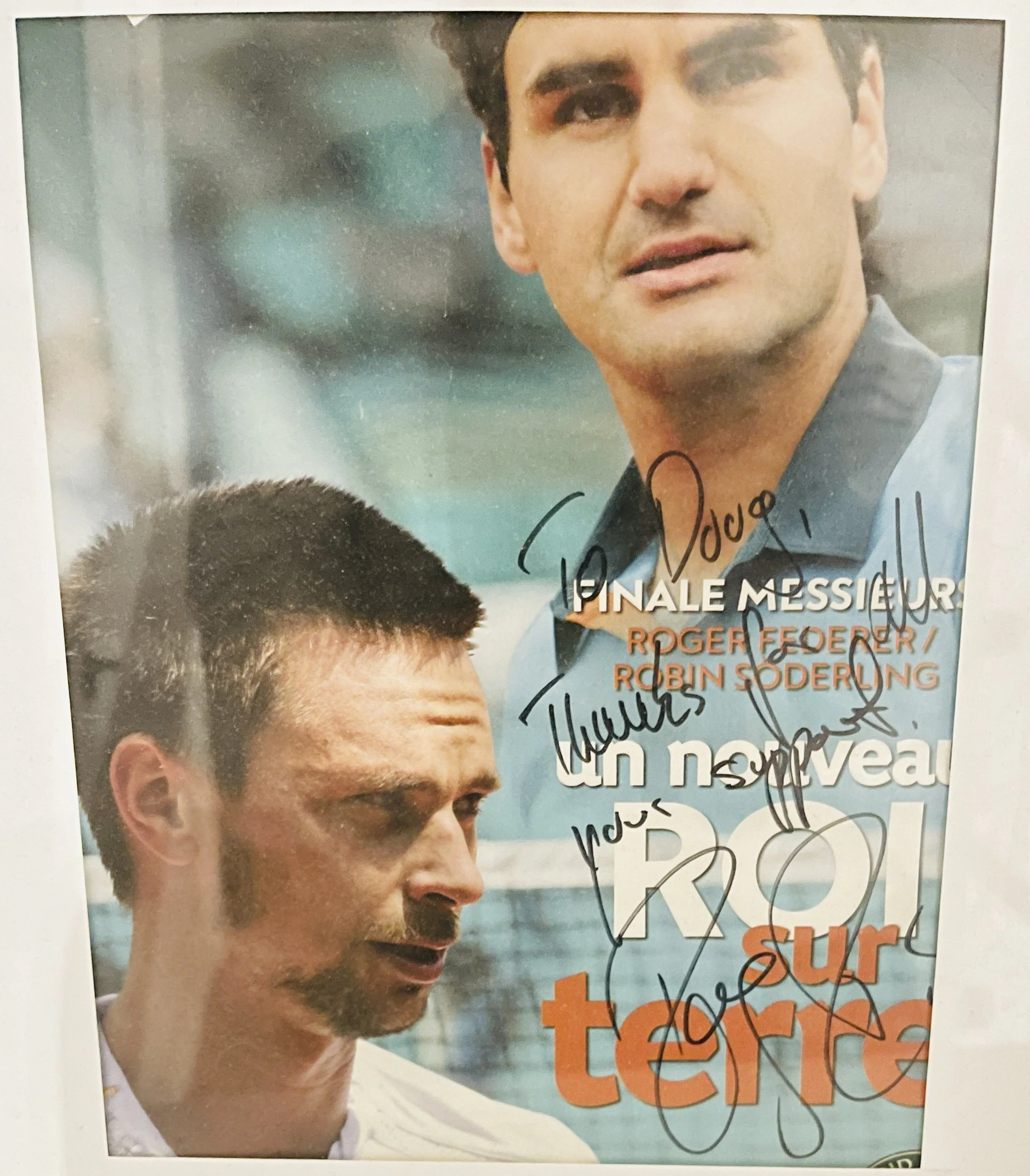 I know I had a few from Serena but I can’t locate them anymore. I think these from RF are special and will be worth a lot of money if I was willing to sell them. Below is another special item. The French Open was always the most difficult tournament to win. Unfortunately for him he played in the same era as Rafa Nadal, who is the best clay court player ever. One year, and only one year an opportunity presented itself when Robin Sonderling beat Rafa. This opened up the draw for Roger and he managed to make the final that year. At the French Open there is a daily magazine that is published and this is the cover of the match being played that day. It took a few years but I managed to get it signed by RF. He would never ever win another French Open.